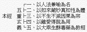 總之,以上所講本經的五名,第一是以境智立名。二、是以機益立名。三、是以性修立名。四、以要妙立名。五、以因果立名。列表於下: