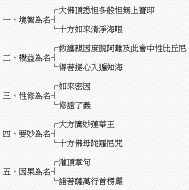 其次「灌頂章句諸菩薩萬行首楞嚴」,此十二字為本經五名中之五。是以因果立名。灌頂章句四字為果;諸菩薩萬行首楞嚴八字為因。