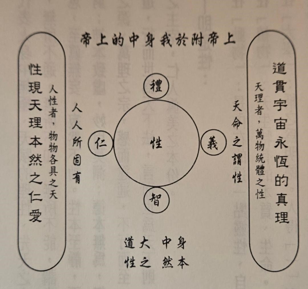 再推「無極之真,二五之精,妙合而凝」,三五之體、用、費、隱;推而至於河、洛、卦、爻,理天、氣天,百王不易之大經大法,以實大人大體之用;則理周性、命,人稟天理,天人一貫;「賦畀」、「稟受」之際,鑿鑿可據。天與人合,人與天通,窮神達化,當前即是,不假強為。