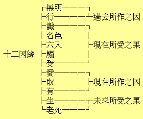 此十二因緣,乃說人生之生死苦果之起源及次序。藉流轉還滅二門以顯示世間及出世間法。流轉者,無明乃至老死之世間法。還滅者,無明盡乃至老死盡之出世間法。