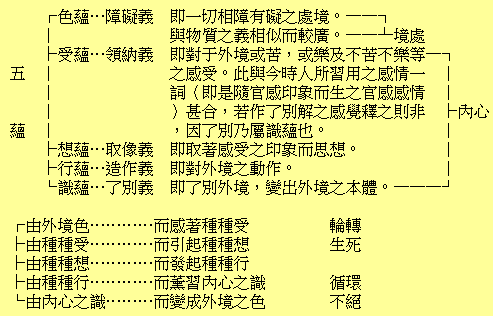 五蘊,即舊譯之五陰也。世間萬法無盡。欲研高深哲理及正當人生觀。應先于萬法有整個之認識,有統一之概念。佛法既含有高深之哲理及正當人生觀,應知亦爾。