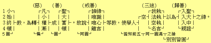 丁依約教詮法通局顯分齊,所詮法即義,亦通心。通則如原教義,能攝前四教之義;局則如小教,不能攝後四教之義;中三教例知各有通局。故賢首宗以義判教,教類有五,教不離義,義不離教故。天台宗約五時判教固佳,然佛說圓教時,有得小益者,說小教時,有發大心者,是別中有通,學者難以去取,不如約義判較穩固。