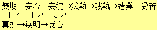 【真前妄後之難】倘是因真如而有無明,則發生疑慮,以為真如在前、無明在後。此即所謂真前妄後之難。今欲說明此事,應如何方可知呢?知道無明無始的存在與真妄同時的存在,此疑問即可冰釋。即真妄皆無始,因而視之為同時存在。便發生真如在前、無明在後的疑問了。所謂無明無始的存在,乃真如緣起論中的根本主義。『論文』中說:『名為一切眾生,而不稱為覺,原是由於念念相續,未曾離念,故曰無始的無明』。又說:『此心本來自性清淨,而有無明』。又說:『因如來藏無前際,故無明之相亦無始』。這些話充分表白了無明無始之義。論者說緣起,說生起,是時間的說明。故回到過去數千萬年的太古原始時代而根究起來,則認為真如在前、無明後來生起的一種謬見,乃由於未能明確徹底了解佛教緣起論的立場而來。蓋佛教緣起論,不用世間所謂進化論的筆法。緣起論的說明,雖是時間的,也常不離實相論的空間的說明。緣起即實相,豎即橫,捕捉宇宙的實相,給與緣起的時間的說明,無論過去現在,真妄都常是無始之物。『義記』中說破此理:『聞依真而有妄,便謂真先妄後。故發生無明有始之見。猶如從外道(數論)的冥初發生覺等』。在數論學派中,說由於用神我諦而起動自性冥諦,成為大,成為我執,展開覺樂等諸現象。故可說神我與自性二者在前、覺樂等在後。這顯然是反對佛教緣起論中的真妄無前後的定論的。故欲領會緣起論的意義,只要知道『論文』中『忽然念起,名為無明』。只是人們似覺宛如無明後生,表明了妄法無體無根據而已。其次,所謂真妄同時的存在,乃確實地表明真如緣起論以實相為根據,足以冰釋真前妄後的誤解了。若要毫無遺憾地說明此真妄同時存在之理,則非討究真如和無明和黎耶的關係不可。蓋此三法的關係,既已說明生滅因緣之義,舉示了梗概。真如是本體,是不起的。並不能說述依真如而起的原因。故『義記』中說明真如,謂『非自性動,但隨他動』。可說充分地說破了真如為宇宙之本體之理。反之,無明和黎耶,乃現象,是說起動之點。關於無明,『論文』中說『依覺故迷』(即由真如起無明)。又說『由於阿黎耶識,故有無明』。(依黎耶起無明)。又,關於阿黎耶識,『論文』中說『依阿黎耶識,故有無明』。(即依黎耶而起無明)。『義記』中則謂『依不覺,故生三種相』(即依無明而起黎耶)。由此觀之,真如是本體,故在無論何種場合都不起。無明與黎耶,乃說起動之點。可見此無明與黎耶二者,實有互為同時的因果關係。更簡短明瞭地說明此關係的,即『義記』中所謂『依似(黎耶)起迷(無明);依迷(無明)起似(黎耶)。此義一時,只是說時有前後耳』。可知在此二義的情況之下,無明與黎耶互為因果,真如則常為緣,三法同時存在。這一燕與法相宗中的玉法展轉同時之說多少有相似之處,故比較的了解真妄同畔存在之理,能脫卻真前妄後的謬見。倘主張無明依真如而存在,則可說真如也依無明而存在;若不能如此說,則真前妄後之疑無由排斥。此種論難,可謂不曾充分會得以上所說的真如為本體門、無明為現象起動門之理的近視者流的妄評。