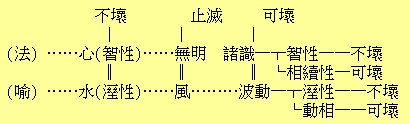 【發端】論到宇宙人生的根本,則皆一味平等,不能有差別。然而何以或者為山,或者為川,或者為非情,或者為有情,或者為動物,或者為植物,或者為禽獸,或者為人類呢?尤其是在人生中間,有迷,有悟,有凡,有聖呢?答曰:一味平等的本體即真如,本來具有恆沙的功德力量,可使人人皆同樣地發起宗教心,同樣地增長信念,同樣地修養,同樣地突入涅槃之域。其所以不然者,理由何在呢?這便要說到無明了。有一種無明的妄法,在﹁味清淨的真如法性的本體界起作用,因此顯現森羅萬象。這好比同一鹹味的水,由於風之緣而發生狂瀾怒濤,男波女波,一起一伏,出現千態萬狀的風光。如此,便輪迴於六道,傍徨於生死之巷,極難到達真如的都門,而發生前後遲速。關於此,起信論中說: