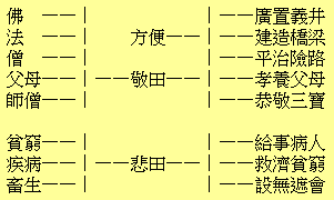 隨緣濟眾,其類至繁,約言其綱,大約有十:第一與人為善,第二愛敬存心,第三成人之美,第四勸人為善,第五救人危急,第六興建大利,第七捨財作福,第八護持正法,第九敬重尊長,第十勸人愛惜物命。