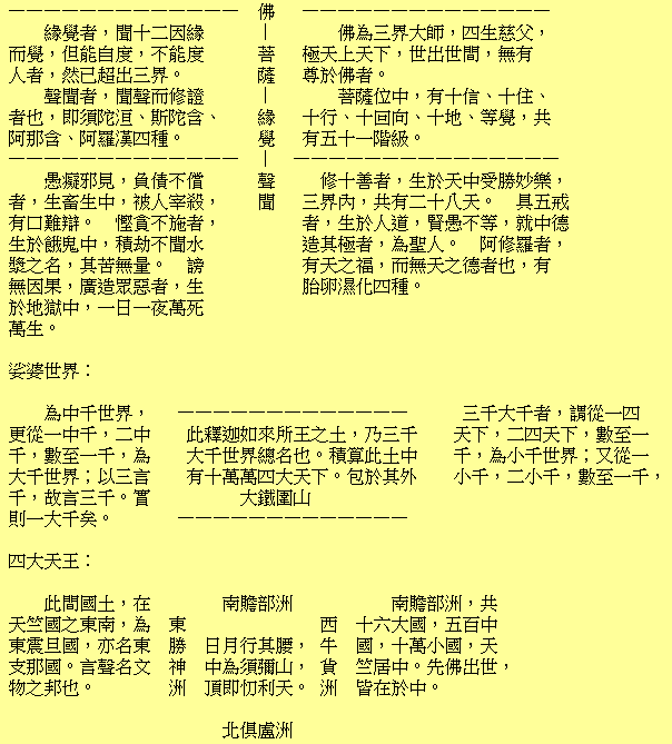 自大地水輪之下,至他化自在天,皆名欲界,以其猶有情欲也。自下至上,共有六天。一四王天(四大天王,分領四大部洲,去地四萬二千由旬,宮殿齊於日月)。二忉利天(梵語忉利,此言三十三,中間為帝釋所居,八方各有四大臣輔之,合成其數,故名。非自下至上之三十三也。去地八萬四千由旬)。三夜摩天(此天以上,為仙家所不知,故道書無此名色)。四兜率天。五化樂天。六他化自在天。六天每過一劫,皆有火災壞之。其間壽命長短及宮殿城邑、身衣輕重等,詳載《藏經》,茲不繁舉。