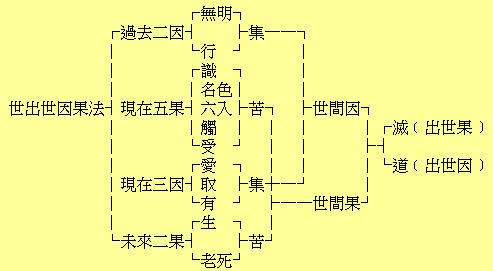 我們看了上表,就知道世間萬法的變動,都有起因和結果,離不開因果關係,但是要使這變動的萬法,回復其本然的寂靜,其過程也離不開因果關係,前者叫做世間因果法,後者叫做出世間因果法。先說世間因果法:世間萬法(一切事理現象)都有生有滅,生滅現象的形成,都有前因和後果。這前因和後果,自無始世以來,一直到未來永久,是永遠連鎖不斷的。為了便利講說,先取其間一段,分做過去世、現在世、未來世來說,各世都有因果關係,彼此相亙連鎖,這叫做三世兩重因果。世間萬法受三世因果律的支配,變化無窮,其表現得最顯著,而且與人類最有切身關係的,就是人類的生死問題。這項重要的生死問題,在三世裏面,表現得非常複雜。歸納起來,有十二個次第,稱做十二因緣法。