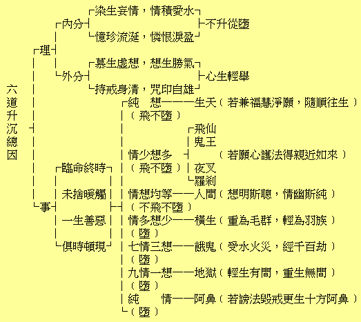 上面經文,地藏菩薩所介紹的輪相占察方法,作用既是那樣大,當然學習就能得大益,所以菩薩告訴我們使用的方法以後,接著又勸誡大家學習,經文接著說:「若佛弟子」,像我們一般學佛求解脫的佛門弟子,若是真心想求得解脫。「但當學習如此相法」,只是應學像這樣理事都能圓通的輪相占法。「至心歸依」,為求得到感通,先拿出至誠心,來歸依三寶,求三寶的加被,信賴這種占法,有了十足的自信力,及三寶的加被力,自然至誠感通。「所觀之事,無不成者」,所要觀察的事情,自然不會得不到圓滿成就的。「不應捨棄如是之法,而返隨逐世間卜筮,種種占相吉凶等事」,不應該捨掉像這樣方便的輪相占法,返而隨著世俗一般求神問卜等等迷信事情,「貪著樂習」,貪著在那些迷信事情上面,喜歡去學習。為什麼說那些是迷信事情,不該學習呢?下文菩薩告訴我們說:「若樂習者,深障聖道。」如果你喜歡學習那些迷信的方法,就深深的障礙了聖道。聖道是成佛的大道。怎麼障礙成佛的大道呢?現在列一個簡單的表,來說明一下: