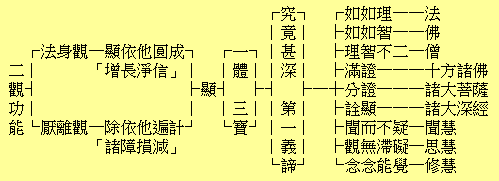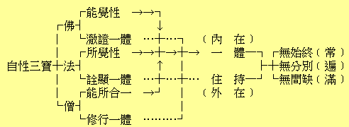 上表所列,先就內在本體說「自性佛寶」:自性佛寶就是人人都有,個個不無本來具有的能覺悟的本性,佛學名詞叫做能覺性;再說「自性法寶」,自性法寶就是所覺悟的一切宇宙森羅萬象的真理,這在佛學名詞上叫作所覺性;再說「自性僧寶」,所謂自性僧寶,就是能覺的本性和所覺的真理,二者聯合所生起微妙作用,稱作是能所合一。這三項都屬於內在的本體,離不開自性,在佛學上叫「自性一體三寶」。再就外在的作用說「自性佛寶」,自性佛寶就是能自我用功修行,徹底證到本性佛果的,這是澈證一體;「自性法寶」就是能運用觀察力詮釋顯現本性佛果的,這是詮顯一體;「自性僧寶」就是能用功自我修行力求明心見性的,這是修行一體,這三項都屬於外在的作用,在佛學上叫「自性住持三寶」。這自性一體及自性住持三寶,不論內在外在,都是本性上的妙用。說到本性,在時間上說,沒有一個開始,也沒有一個終了,永久存在,這就是「真」;按空間說,沒有所謂內裏,也沒有所謂外表,無所不在,這就是「遍」;若按所起的作用來說,渾侖圓成,沒有間隙,沒有缺欠,這就是「滿」。我們修觀想的人,明白了自性三寶的本體是真常的,普遍的,圓滿的意義以後,在觀想的時候,見到當前的三寶聖像,就應當悟知盡虛空,遍法界一切的佛法僧三寶,都是一個本體,都是真常、普遍、圓滿,這樣的觀想,就是稱性的總觀想。是我們修供養的人,必須要知道的。