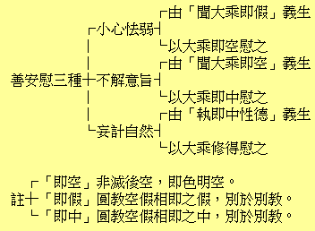 照上表看,說到空,行人若能悟開了空的諦理,則世間萬象皆空,即最高涅槃寂滅空理,尚且是空,何況依空而生的身心情見;說到假,行人若能悟開了假的諦理,則世間萬象皆假,即最高涅槃寂滅之理,尚且是假,何況依涅槃而生的身心情見;再說到中,行人若能悟開了中道諦理,則世間萬象皆非空非假,即生死煩惱,也是非空非假,更說什麼身心情見。所以經文說,得離怯弱,沒有情見的執著,何來怯弱,這是小心怯弱的眾生,得到菩薩善安慰的益處。