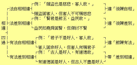 這一段經文是標明地藏菩薩所說甚深大乘法義,是完全的對,沒有絲毫錯誤,怎麼證明呢?因為真理是離相違過的。什麼是離相違過呢?離是離開,相違過是因明學名詞。西方論理學分二種流派,一是希臘的邏輯學,一是印度的因明學。應用在社會方面,多採邏輯;應用在佛典方面,多採因明。在因明學上論理時,有十四種過錯,其中有四種是不能成立的,有六種是與真理不相應的,有四種是互相違背的,本文僅就相違四過,約略說明,參看下表: