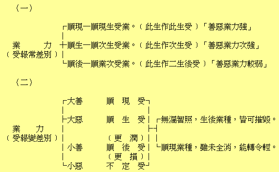 「業」大略可分善業、惡業;或者是有漏業、無漏業。在這些分別中,若是單純的說善業和惡業,尚不難明白,但若說到有漏無漏上,就不簡單了。因為單純的說善與惡,只是就人的情感作用,作主觀上的認定,什麼是好,什麼是壞而已。如果進一步作深入細微的觀察,人所作的善惡業,說好,好到什麼程度?說壞,又壞到什麼程度?這其中就有非常的區別了。這種微妙的區別的總名詞,就是有漏與無漏。那麼,什麼叫做有漏與無漏呢?這要先說明「漏」字。所謂漏,通常是指盛水的器物不完整,向外漏水。在佛經上是借用它來形容本性不純淨,向外漏煩惱說的。這裏所說的有漏,就是說凡本性不純淨所造的事業,如果是惡的招苦報,時時在煩惱之中,固然是有漏,即便是善的招福報,福的本身即是貪著,何況福有盡時,脫不了煩惱圈,仍屬有漏。所以經上把凡是造作能感人天三界果報的業,通歸於有漏業。說到無漏,凡所造作的事業只要是清淨無染,便能感出世果報,因為它不攀緣五欲六塵,不向外漏煩惱,就叫無漏業。但有漏無漏這樣的講,仍是單純的粗講,只是說人天沒有斷盡世俗煩惱,仍在三界生死為有漏,小乘斷盡世俗煩惱,超出三界不再生死為無漏。若再深一層詳細分析,拿小乘聲、緣與大乘菩薩比,就不同了。小乘聲、緣,雖斷盡世俗煩惱而能自了,但沒有大悲心,不能入世普度他人。地前菩薩自度而兼度人,出世而兼入世。出世部份,不染塵俗不漏煩惱,是無漏,而入世部份隨順世俗漏煩惱,又是有漏。這樣看菩薩的業是兼具「有漏」「無漏」,然而地上菩薩能在塵不染,既不是有漏,雖超出塵俗,而念念度生,又不是無漏。這樣又可以說是「非有漏,非無漏」了。至於佛,就不同凡夫的地方說是「非有漏」,就不同小乘的地方說是「非無漏」,如就不同菩薩的地方來講,又是非「非有漏」,非「非無漏」了。到了佛的這種境界,才算是「業」盡情空。斷盡一切煩惱,才能主宰一切,而不被一切支配,這就是業力的微妙究竟處。前面所提到的顏子與盜跖兩種不同的典型人物,他們的業力如何?為什麼他們所遭受的善惡果報,是那樣的不相稱呢?這裏再把業力的作用約略介紹一下:業力的作用,是能牽引神識受報。受報的種類,大略可分四種:一是現生作業現生受報,叫「順現受」。二是現生作業,第二生受報,叫「順生受」。三是現生作業二生以後才受報,叫「順後受」。再一種就是由於業力的強弱,及遭遇的機緣的不一樣,或者懺悔的關係,使前三種受報時期不定,叫做「不定受」。顏子和盜跖,雖作業與受報很不相稱,但也不超出這四種業力作用以外,至於要問屬於那一種?他們全是受宿生業力的支配,應該屬於後三種,以上「業」的解釋,大致如此。