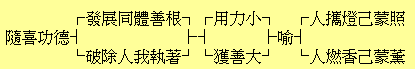 全部經文分為三大部份:一是序分,二是正宗分,三是流通分。這是晉朝道安法師所創立的分科辦法,在當時稱為「彌天古判」,後人解經都是遵照這個辦法分科,現就依照這個次序解經: