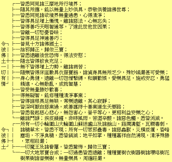 隨所在處,若諸有情,或為多聞,或為淨信,或為淨戒,或為靜慮,或為神通,或為般若,或為解脫,或為妙色,或為妙聲,或為妙香,或為妙味,或為妙觸,或為利養,或為名聞,或為功德,或為工巧,或為花果,或為樹林,或為床座,或為敷具,或為道路,或為財穀,或為醫藥,或為舍宅,或為僕使,或為彩色,或為甘雨,或為求水,或為稼穡,或為扇拂,或為涼風,或為求火,或為車乘,或為男女,或為方便,或為修福,或為溫暖,或為清涼,或為憶念,或為種種世出世間諸利樂事。於追求時,為諸憂苦之所逼切。有能至心稱名念誦歸敬供養地藏菩薩摩訶薩者,此善男子功德妙定威神力故,令彼一切皆離憂苦,意願滿足;隨其所應,安置生天涅槃之道。