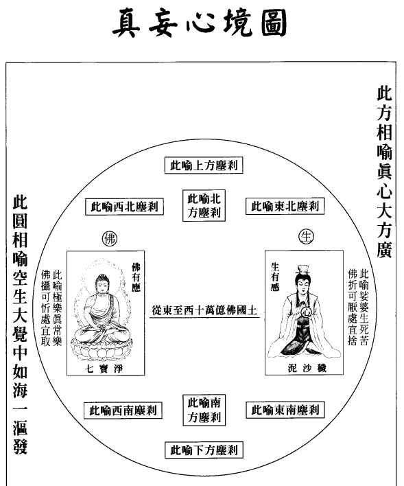 其內的一個圓相,譬喻十方無邊之虛空也,而其圓形內的十個小方形之相,則是譬喻十方各如微塵數之世界也。而其內人形的身中有一個心字,乃是譬喻你如今胸中所蘊藏的六塵緣影之妄心也。此虛妄的緣影之心在我的身中,而我色身在此世界之中,世界則在虛空之中,虛空則在廣大覺性本然的真心之中。