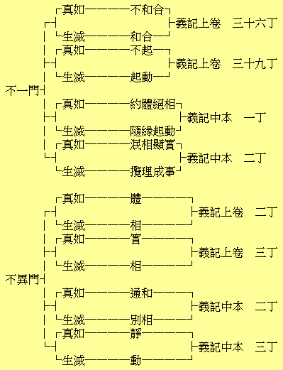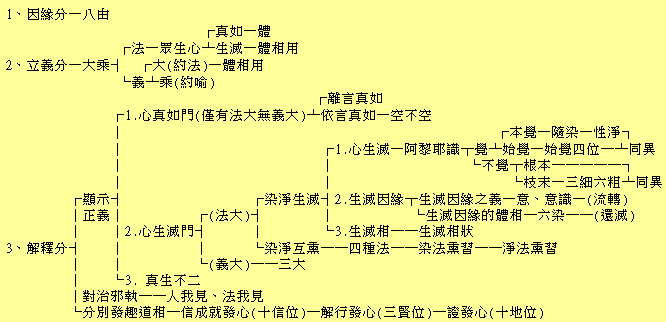再從教理上觀看本論一部的大意,可說本論實在是把緣起和實相方面合起來說述。無論說明何物,有時間的說明,同時不可沒有空間的說明。即須從豎的緣起論和橫的實相論兩方面觀察。所謂緣起論,是論述萬有的開發變化,說明所謂生滅輪迴的因緣相狀,又闡明還滅解說的因緣相狀。所謂實相論,是直接把握本體或現象,而討究本體為何物、現象是真實抑虛妄。今就起信論看來,所謂一心,所謂心真如門,主要是就實相方面說明;所謂心生滅門,主要是就緣起方面說明。但在實相方面,僅僅肯定本體為真實,而把現象盡行否定為虛妄。在緣起方面,則主張真如緣起說,但緣起和實相的兩面觀,則秋毫亦不可離,所以不可截然區別,到處交錯關聯。欲斷本論全部的宗要,可說是鼓吹真如緣起論,實相論不外乎少量的加味。