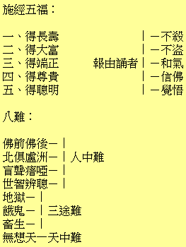 〔發明〕難有多端,約言之,不出七種:一水、二火、三官非、四盜賊、五刀兵、六饑饉、七疾疫也。在水火者,以拯拔為救;在官非者,以昭雪為救;在盜賊刀兵者,以脫離為救;在饑饉者,以財帛為救;在疾疫者,以醫藥為救。救均發於至誠。見人之難,如己之難,盡其智謀,竭其財力,使救之之念,十分圓滿而後已。難至而救,救之有形者也,孔子所謂「聽訟吾猶人」也。復有一法,使人自然無難,其功更有倍焉,則孔子所謂「使民無訟」矣。何則?人之患難,皆前業所致,今世不種苦因,來生自無苦果。若能勸人不造殺盜淫妄之業,則救人之難亦多矣。是故救難於已然,所救有限;救難於未然,其救無窮。救難於已然,凡夫之善行;救難於未然,菩薩之修持,二者並行不悖。 下附徵事(二則)